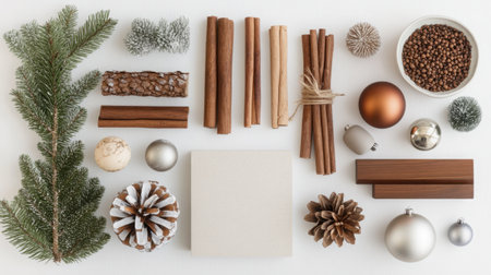 Flat lay of holiday decorations including fir twigs, cinnamon sticks, and ornaments surrounding a neutral presentation space.