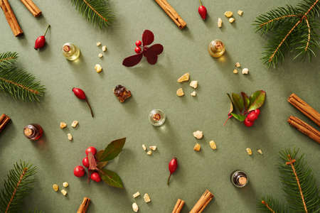 Christmas background with bottles of aromatherapy essential oil with frankincense, wintergreen, rosehips, cinnamon and spruce