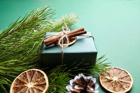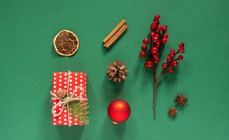 Holiday green background , red gift box and thuja twigs with christmas tree cone ,christmas ball and dry citrus, star anise and cinnamon sticks and a sprig of hawthorn , merry christmas , flat lay
