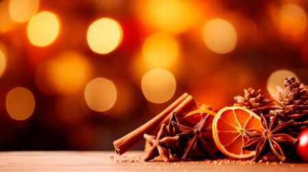 christmas spirit fragrant spices anise and cinnamon lie on a wooden table, dry slices of orange