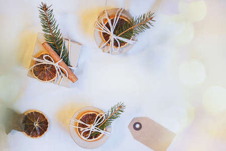 Top view eco-friendly wrapped Christmas gift boxes decorated with natural dried orange, cinnamon stick and spruce branch on the white background. Christmas time, handmade, zero waste package ideas.