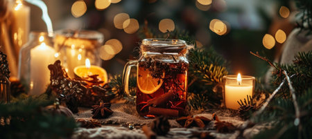 a jar with spiced tea near some candles and decorations.