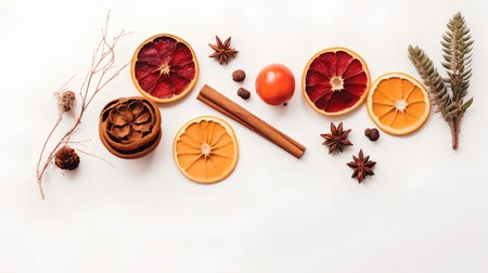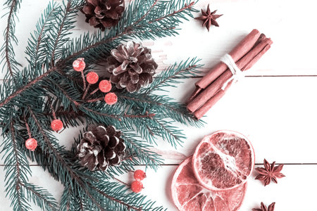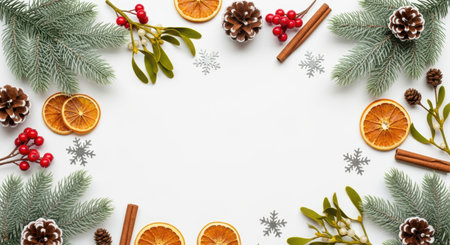 Festive winter composition with fir branches dried oranges pinecones cinnamon sticks mistletoe and red berries on white background.