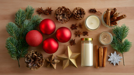 A festive flat lay composition of Christmas decorations and aromatic spices arranged on a light wooden surface. Elements include red Christmas baubles, pine cones, fir branches, a golden star, star anise, cinnamon sticks, a lit candle, and a snowflake ornament, creating a warm and inviting seasonal aesthetic.
