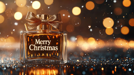 Transparent perfume bottle with Merry Christmas text and a bow on golden bokeh background with copy space. New Year gift