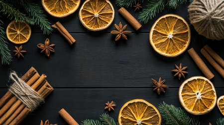 An elegant flat lay of dried orange slices, cinnamon sticks, and star anise on a dark wooden background. Ideal for holiday themes and seasonal crafts.