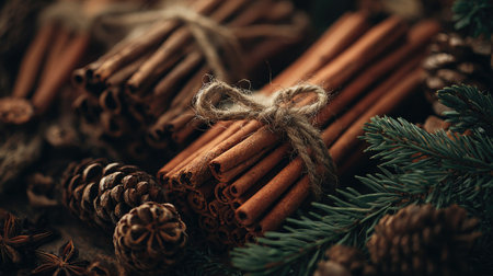 This image showcases bundles of cinnamon sticks tied with twine, alongside pine cones and evergreen foliage. The warm brown tones of the cinnamon contrast with the green of the foliage. The composition is close-up, highlighting texture and detail, suggesting a natural setting. Suitable for use in a variety of commercial and editorial projects.