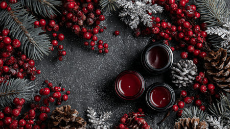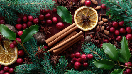 A top-down view showcases a decorative arrangement featuring cinnamon sticks, cranberries, and star anise. The composition is rich with shades of red, green, and brown, highlighted by natural lighting. This image conveys a sense of warmth and is suited for various festive and decorative uses.