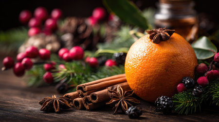 An orange, star anise, cinnamon sticks, and berries are arranged on a wooden surface, with surrounding greenery. The image showcases a shallow depth of field. The scene evokes warmth and natural elements. It may be suitable for food-related projects, holiday-themed designs, or general lifestyle content.