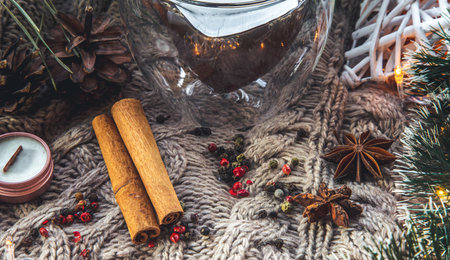 Christmas background with spices and decor details on a knitted background.