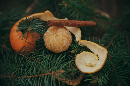 Christmas decoration with fir branches, tangerines, pine cones, and decoration elements , selective focus