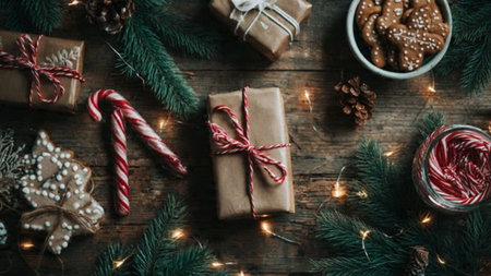 Flat lay of holiday-themed decorations including ornaments, candles, and candy canes