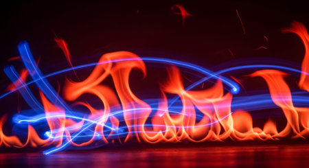 Flames dance and swirl in vibrant colors, showcasing a mesmerizing blend of orange and blue hues. The artistic freeze shot emphasizes the fluidity and movement of fire.