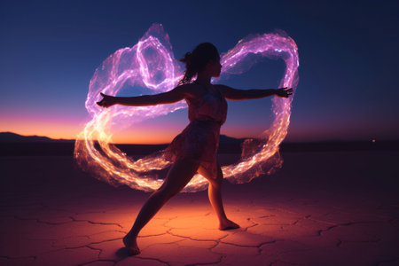Woman dancing in desert in light painting lines. Epic night effect. Generative AI