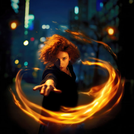 Young redhead witch casting a fire spell with a hand gesture against modern city night setting. Contemporary fantasy concept, generative AI