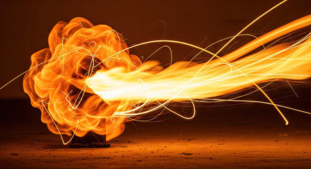 Dynamic fire sparks flying against a black background create a mesmerizing visual effect
