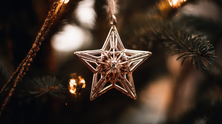 A delicate golden star hangs on a Christmas tree surrounded by vibrant green branches and soft twinkling lights.