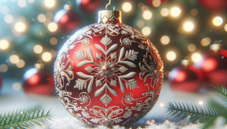 A vibrant red ornament with intricate silver designs hangs from a lush Christmas tree. Shiny baubles and greenery create a festive atmosphere during the holiday season.