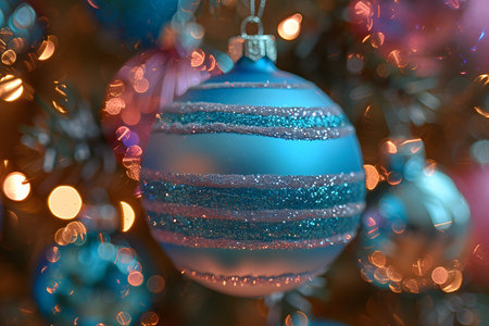 A close-up of a blue christmas ornament adorned with glittery stripes, hanging on a christmas tree. the background features a bokeh effect with warm golden and cool blue lights, enhancing the festive atmosphere and holiday spirit. Generative AI