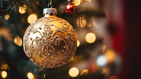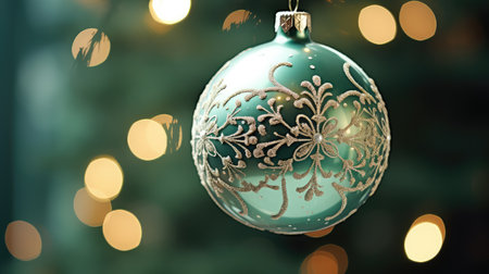 This enchanting image features a detailed Christmas tree ornament that sparkles amidst a backdrop of soft bokeh lights, evoking a cozy and joyful holiday spirit.