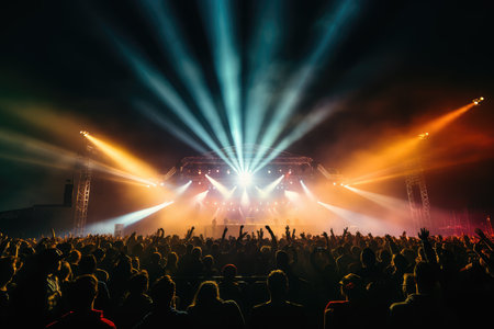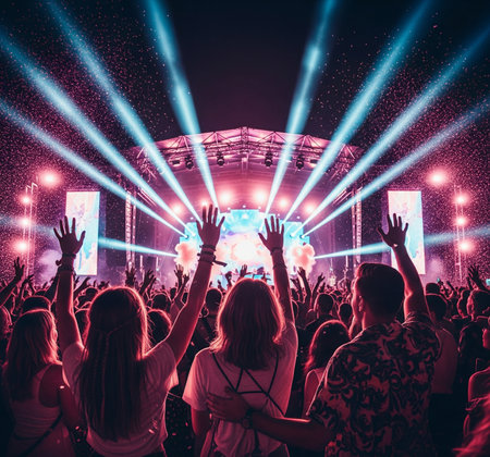 Stage lights and crowd of audience with hands raised at a music festival. Fans enjoying the party vibes.
