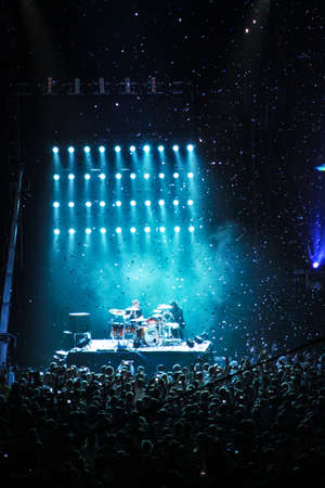 Big concert, a show with lighting effects and a big stage. Dance atmosphere