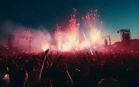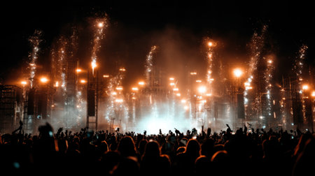 A vibrant crowd revels under a breathtaking fireworks display at a night concert, capturing the essence of celebration and excitement.