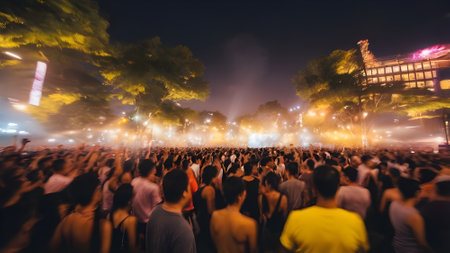 Unfocused image of a joyful crowd with raised hands enjoying a night celebration with colorful fireworks and confetti.