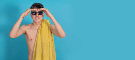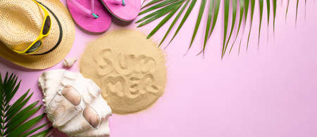 Summer vacation concept flat lay. beach accessories and towel top view. Space for text. travel concept.