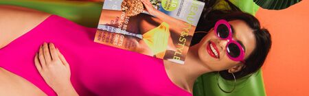 panoramic crop of cheerful young woman in sunglasses and swimsuit lying on inflatable mattress with magazine near palm leaves on orange