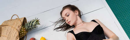 Top view of stylish young woman looking at fruits on handbag near swimming pool at resort, banner