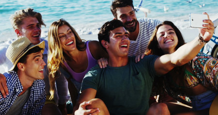 Image of emoji icons flying up with a group of young Caucasian friends taking a selfie on a beach in the background 4k