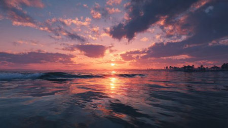 A beautiful sunset over the ocean, capturing the serene waves under the twilight sky. The golden hues of the sky reflect over the calm waters, showcasing a tranquil and peaceful scene. Ideal for relaxation and nature themes.