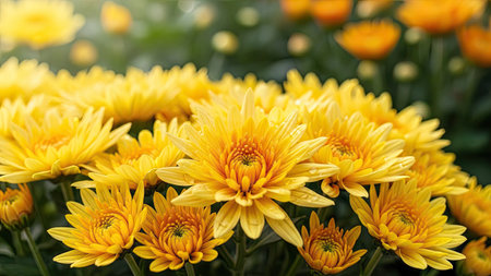 yellow and orange chrysanthemums on a blurry background. In autumn, beautiful bright chrysanthemums bloom luxuriantly in the garden.