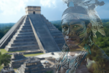 translucent native American against mayan pyramid ruins, ghost of the past