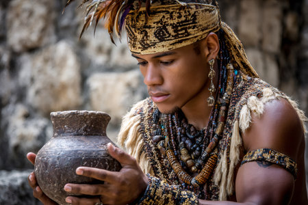 Man in traditional clothing holding an ancient pottery jar against a stone background