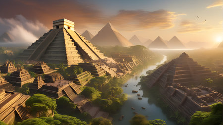 This captivating image features a breathtaking scene that merges architectural wonders from various ancient civilizations into a lush, verdant valley. Dominating the foreground is a massive Mesoamerican pyramid reminiscent of El Castillo from Chichen Itza, surrounded by smaller step pyramids, bustling with people. In the middle ground, an expansive river snakes through the valley, flanked by more pyramids and dense tropical foliage. The background showcases the iconic Egyptian pyramids of Giza, shrouded in mist, under a golden sunrise sky. This fantastical combination of worlds evokes a sense of mystery and exploration in a mythical El Dorado setting.