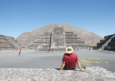Teotihuacan, Mexico. A Mexican American tourist with a backpack and hat enjoys the view from the top of the Moon Pyramid. The Sun Pyramid and Avenue of the Dead can be seen in the distance.