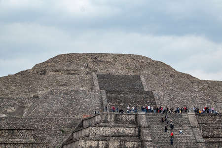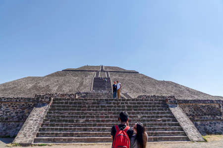 MEXICO CITY, MEXICO - JANUARY 30 2019 - Tourist climbing Teotihuacan pyramid ancient ruins one of the country most famous and visited archeological sites