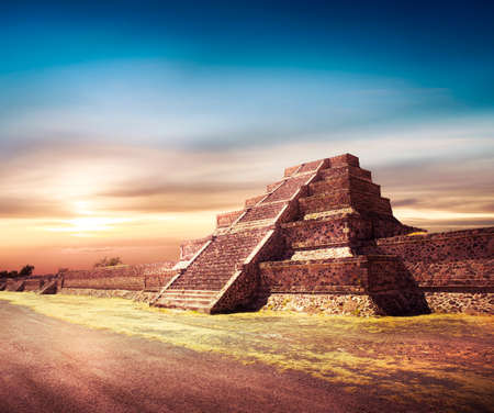 Beautiful Mayan pyramid complex at sunset with dramatic sky