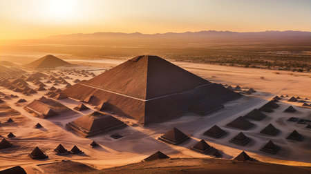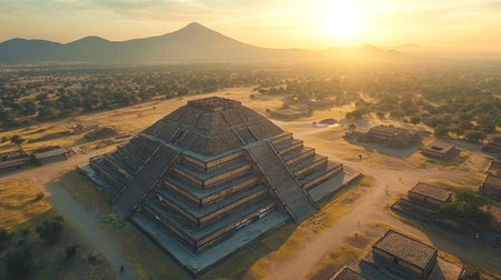 Majestic sunset over teotihuacan pyramids with golden sky and mountain backdrop