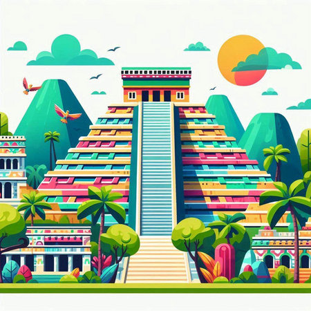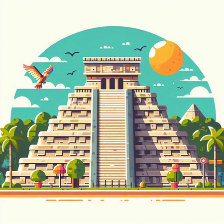 A majestic pyramid stands tall, a testament to the ancient Mayan civilization. Its intricate structure and weathered stone whisper tales of a bygone era.
