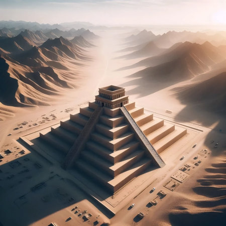 hazy, atmospheric shot of a pyramid at sunrise, created with generative ai