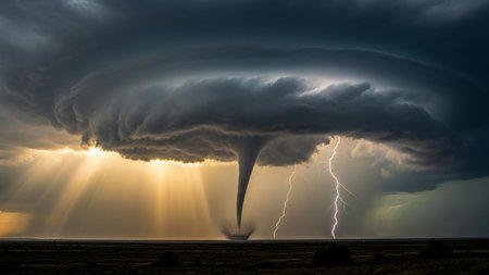 Dfgdguh showing massive tornado with lightning and sunbeams over flat landscape. High resolution image...