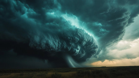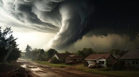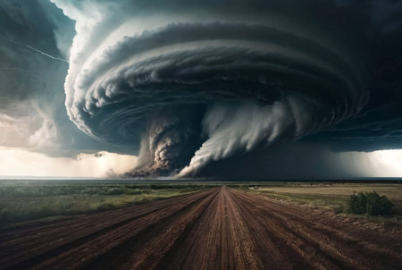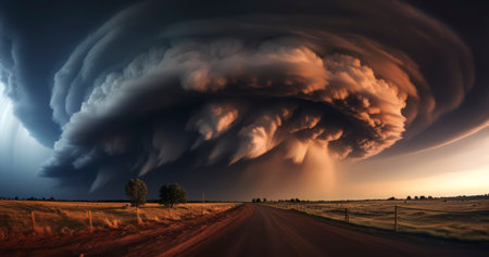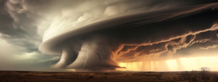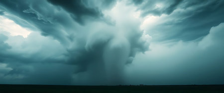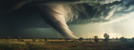 Scenery of massive tornado, huge cyclone, apocalyptic feeling. Thunderstorm landscape of natural disaster. Global earth ecology problem, climate change concept. Gen ai illustration. Copy ad text space