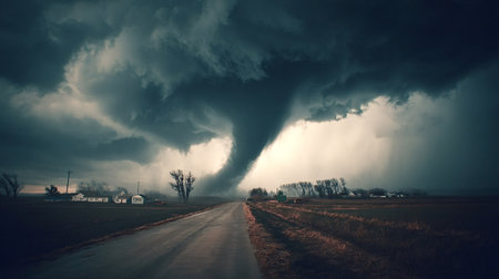 Large funnel cloud descends from dark, rotating storm clouds over fields and a quiet country road, evoking feelings of danger, destruction, and the raw power of nature