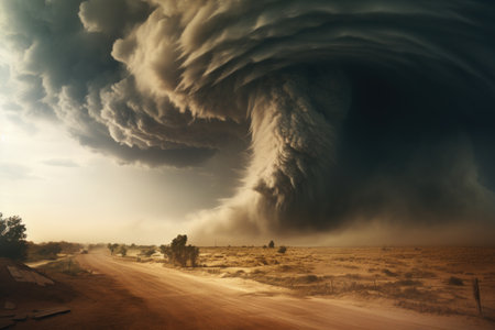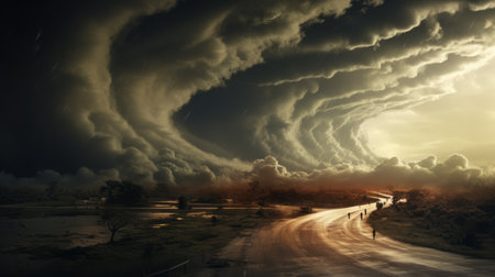 A dramatic scene depicting swirling dark clouds above an empty road, representing the awe-inspiring power of nature and its atmospheric beauty.