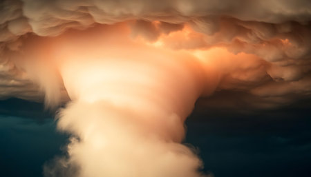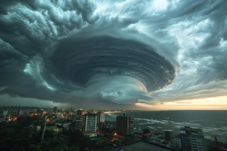 Aerial view of swirling hurricane clouds at sunset, dramatic natural phenomenon. Weather and climate concept