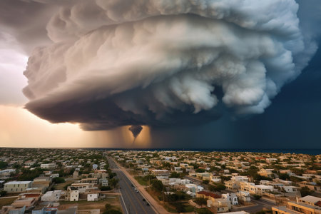 storm clouds loom ominously over a highway, casting an eerie glow on the surrounding buildings. this surrealistic fantasy landscape captures the essence of tumblewave and backlit photography, with swirling vortexes adding a touch of mystique. the highly detailed, nature-inspired imagery showcases a mesmerizing blend of dark orange and white hues, reminiscent of a captivating and otherworldly illustration. ai generated