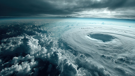Dramatic aerial view of a powerful hurricane with eye over the ocean